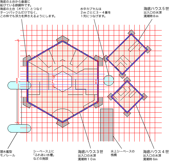 ![]() 次に造る海底村の海底ハウスは、このようなものにしてはどうかと図面を書いてみました。 ![]() ★〜★〜★〜 解説〜★〜★〜★ ◎ 3基の海底ハウス(水深10mの海底にあるのは、大型の海底ハウス3世だけで、 水深4mの小型ハウス4世とその中間に位置する水深8mの中型ハウス5世は、 海底ハウスではなく海中ハウスになります。 ◎ 3世、4世、5世の中心に素潜り中継ポイントの水中カプセルが水深2mおきに設置され、 最初の水中カプセルから2mでアクセスできるのが小型ハウス4世、 2番目の水中カプセルから2mでアクセスできるのが中型ハウス5世、 そして3番目かその次の水中カプセルから2mでアクセスできるのが、 大型の海底ハウス3世となりうます。 ◎ 水上シーベースの桟橋から下をのぞくと、最も浅いところにある小型海中ハウス4世の天井が見え、 その天窓を通して海中ハウス4世の中の人の顔も見ることができるでしょう。 ◎ 大型海底ハウス3世の左に位置するのが潜水艦型モノレールです。 これは水中エレベーターとも言え、これまでの海底ハウスには 最低でも2m以上潜ることができる人しか入ることは出来ず、 もちろん水に濡れて入るしかできませんでしたが、 この潜水艦型モノレール(水中エレベータ)によって、潜ることができない人でも 服を着たまま濡れることなく水深10m、2気圧下の海底体験が可能になります。 ◎ 小型海中ハウス4世では休憩することや、 天候や海面の状態次第では空の月や星を海の中から見ることができ、 中型海中ハウス5世では、圧力の違う地上とは別世界 というものを体験することができ、大型海底ハウス3世では サテライトスタジオや数十名でのイベント、宿泊もできる施設として考えています。 ![]() いかがでしょうか? 海に囲まれた日本の海の中に、今このような施設があったとしたら。。。 海の中で地上と同じように呼吸をし、飲食をし、仲間と語らい楽しむことだけでも、 それは楽しく、忘れられない時間となります。 しかし、それだけではありません。 海中というのは宇宙よりも身近でありながら厳しく、しかし優しく、 人の心や身体にどれだけの影響を与えてくれるものなのか。 ここに入った人は、海を通じて、地球というもの、自然というものを 強烈に感じずにはいられないでしょう。 それによって、日々の悩みがどれだけちっぽけなことかを実感し、 生かされている自分というものを発見することでしょう。 その経験者、体験者が確かにここにおります。 自然や地球に対する意識を高めてくれる経験としては、 おそらく他に類を見ないほどの効果をもたらしてくれることを確信しています。 この海中体験で意識が変わる人が増えるたびに、 地球と人類の共生期間は伸びていくのではないかと思います。 こんな施設があったらいい、いや 今この時代にはなくてはならないものではないかと思えてはきませんか? -*--*--*--*- -*--*--*--*-
